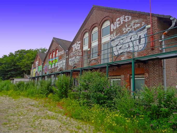 Keywords: old building graffiti railway station fallow land wild weed wall brick construction leave color