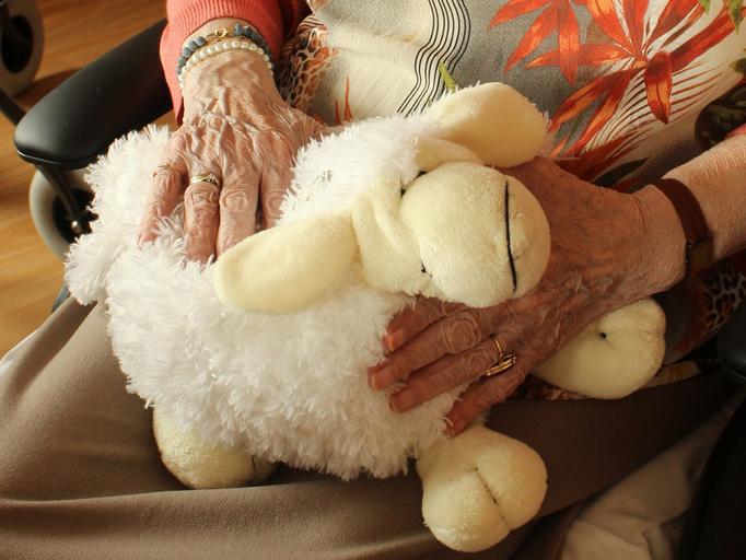 Keywords: old house granny grandmother hands hug stuffed animals old