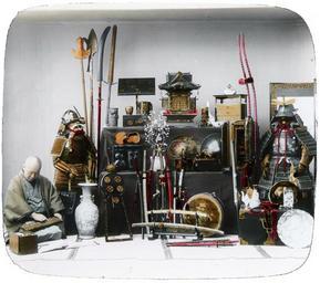 | Keywords: Old Japanese military paraphernalia.jpg A collection of Japanese cultural objects including military paraphernalia Japanese armour yumi yari katanas and tachi among others as well as a small shrine furniture porcelain and lacquerware Hand-colored glass slide http //www flickr com/photos/24443965 N08/2329877474/ Flickr circa 1892 -95 T Enami 1859-1929 PD-Japan-oldphoto Assessments 1 Japanese military paraphernalia cropped to white background dust/scratches removed Brandmeister Military of early modern Japan 1850s-1914 Historic samurai photographs Historic depictions of yari Hand-colored photographs Japan in the 1890s T Enami |