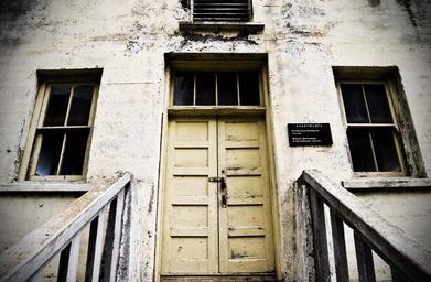 Keywords: old school house door wooden facade chalked windows building architecture vintage entrance