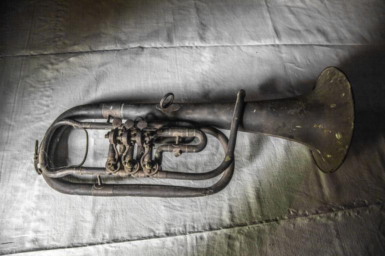 Keywords: old trumpet rusty antique trumpet old instrument music musical sound brass horn worn forgotten nostalgic photographic
