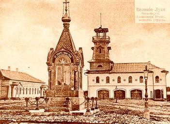| Keywords: Old velikiye luki 9.jpg ru Часовня Св Александ а евского; слева - здание го одской Думы пост оенное в 1793 году; сп ава - пожа ное депо с каланчой на его месте сейчас музыкальная школа им усо гского А хив Великолукского К аеведческого музея Author ачало XX в е позднее 1917 года PD-RusEmpire Velikiye Luki Fire stations in Russia Chapels in Pskov Oblast PD-old |