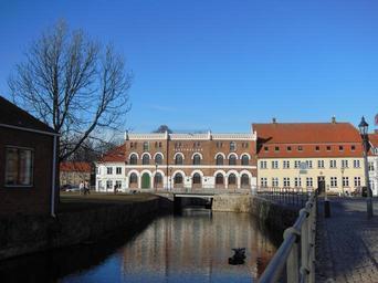 Keywords: old water mill castle mill old town moat old townhouse cobblestone street blue sky sunshine history heritage denmark funen nyborg blue yellow red