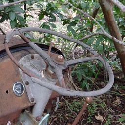 Keywords: old worn rusty tractor steering wheel vintage antique aged brown weathered rustic farm machinery broken down abandoned rough run-down cracked ruined damaged rotting old-fashioned destruction