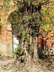 Keywords: older tree gnarled leaves aesthetic home wall masonry tribe log green building