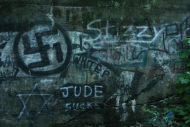 | Keywords: OldHwy122graffiti.jpg North of Ashland Pennsylvania is a road to nowhere called the Catawissa Road or Old U S Highway 122 an abandoned and decaying stretch of asphalt that ends at vast heaps of mining debris toward the outskirts of the abandoned towns of Byrnesville and Centralia Above this road it appears there once ran a railway overpass long since abandoned which either bridged a great chasm to the west or else predated it What remains are heavy stone supporting structures to either side of the road upon which have been sketched a variety of racist mementoes Of these perhaps the most disturbing is the date June 2007 which is echoed by other such comments scrawled up and down the road from 2006 Transferred from http //en wikipedia org en wikipedia 2008-05 Mike Serfas The copyright status and copyright holder of the original graffiti is unknown but it might be regarded as promotional material freedom of panorama or too lacking in original content to be copyrighted Legal objections to graffiti might also undermine the original authors' copyright claims on the original artwork A fair use case could also be made if necessary Public domain release below regards my photography Nazi symbol Mike Serfas Original upload log page en wikipedia OldHwy122graffiti jpg 2008-06-02 04 57 Mike Serfas 400×267× 77511 bytes <nowiki> Photo taken by me at 40°47'8 36 N / 76°20'36 18 W in 2008 The copyright status and copyright holder of the original graffiti is unknown but it might be regarded as promotional material freedom of panorama or to</nowiki> Graffiti in Pennsylvania |