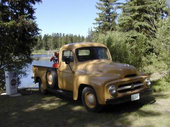 Keywords: oldtimer yellow truck car automobile vehicle gas station lake