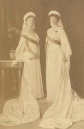 | Keywords: Olga and Tatiana in court gown 1913.jpg en Photograph of Grand Duchess Olga Nikolaevna 1895-1918 and Grand Duchess Tatiana Nikolaevna 1897-1918 They are standing together on a raised platform with Grand Duchess Olga on the left holding a fan Both are wearing court dress including sashes and veils There is a vase of flowers on the ornate table to the left The Grand Duchesses Olga Nikolaevna and Tatiana Nikolaevna were the eldest daughters of Nicholas II Emperor of Russia https //www royalcollection org uk/collection/search /10/collection/2926948/grand-duchesses-olga-nikolaevna-and-tatiana-nikolaevna Royal Collection Trust RCIN 2926948 Boissannas et Eggler St Petersburg 1913 PD-old <gallery>File Olga és Tatjána in court gown 1913 jpg</gallery> Boasson and Eggler Olga Nikolaevna of Russia in family photographs Tatiana Nikolaevna of Russia in family photographs |