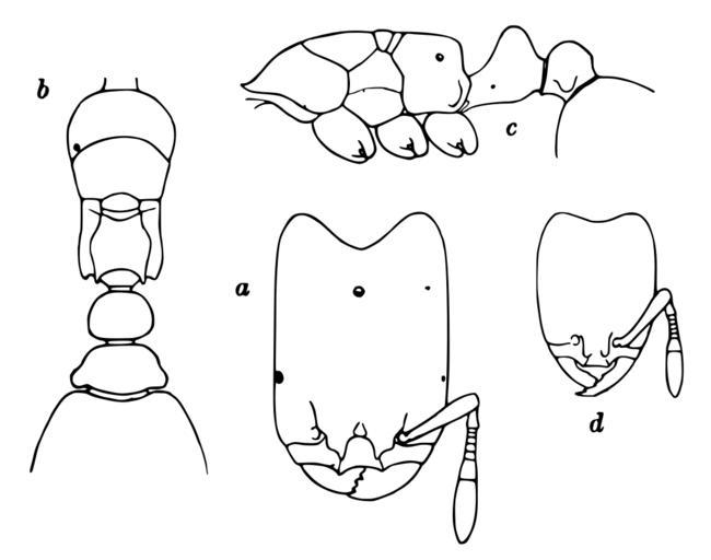 | Keywords: Oligomyrmex.panamensis.-.wheeler.svg Oligomyrmex panamensis a head of soldier or ergatoid dorsal aspect; b thorax and pedicel of same dorsal aspect; c same in profile; d head of worker dorsal aspect A new guest-ant and other new Formicidae from Barro Colorado Island Panama Biological Bulletin 49 150-181 http //research amnh org/entomology/social_insects/ants/publications/3382/3382 pdf PDF 1925 W M Wheeler pd-old PD-old Drawings of animals by William Morton Wheeler Drawings of ants Oligomyrmex panamensis |