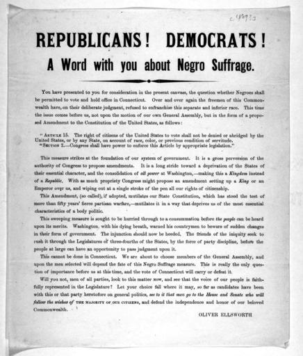 | Keywords: Oliver Ellsworth Negro suffrage.jpg en Circular written by 'Oliver Ellsworth' on the question of Negro suffrage addressed to Republicans and Democrats The Library of Congress Washington D C http //memory loc gov/rbc/rbpe/rbpe00/rbpe009/00901700/001dr jpg Oliver Ellsworth ca 1869 PD-old Oliver Ellsworth |