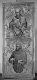 | Keywords: Olivuccio di Ciccarello da Camerino - Madonna and Child with Saints Peter, Paul, John the Baptist, and Francis - Walters 37699 - Front Right.jpg The intact condition and unique format of this altarpiece make it a truly remarkable painting The central panel depicts a stunning Madonna and Child flanked on the left by half-length figures of St Peter above St John the Baptist and on the right by St Paul above St Francis of Assisi The Virgin's robe is carved and decorated with gold leaf that shimmered in the candlelight a surface treatment common in Byzantine paintings Because of the crescent moon at her feet the rays emanating from her body and the gold curling through her cloak the Virgin seems to hover behind the frame The molding of the inner frame crops the composition like an open window offering a glimpse into the sacred timeless realm beyond On the back of the left wing are two preparatory drawings by the artist For more information on this piece please see Zeri catalogue number 41 pp 68-71 ca 1410 1420 Medieval oil and gold leaf on panel Central panel H including frame 63 x W 30 3/8 x D 1 1/4 in 160 x 77 2 x 3 1 cm ; Left wing H including frame 63 1/4 x W 27 9/16 x D 1 1/4 in 160 6 x 70 x 3 1 cm ; Right wing H including frame 63 5/16 x W 27 5/16 x D 1 1/4 in 160 8 x 69 3 x 3 1 cm accession number 37 699 22289 Don Marcello Massarenti Collection Rome prior to 1897 mode of acquisition unknown 1897 catalogue no 30 as Tuscan School early 15th century Henry Walters city Baltimore Walters Art Museum Henry Walters Acquired by Henry Walters with the Massarenti Collection 1902 Transcription Inscribed on Virgin's halo AVE MARIA GRATIA PLENA; Translation Inscribed on Virgin's halo Hail Mary full of grace; Transcription Inscribed on the bottom left panel in two roundels P E; Transcription Inscribed on bottom of right panel in two roundels T R; Inscribed on scroll held by John the Baptist ECCE/AGNVS/DEI QVI/TOLLIS/PECCATA MVNDI; Translation Inscribed on scroll held by John the Baptist Here is the Lamb of God who eliminates the sins of the world God's Minstrel St Francis of Assisi The Walters Art Gallery Baltimore 1982 place of origin Marche Italy Walters Art Museum license 2D Medieval art in the Walters Art Museum Olivuccio di Ciccarello da Camerino Paintings in the Walters Art Museum Madonna and Child |