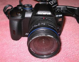 Keywords: Olympus520 camera front.jpg en Picture of Olympus 520 DSLR camera own RJFJR 12/24/08 taken with Canon A300 Olympus E-520