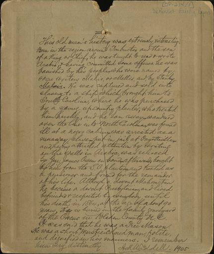 | Keywords: Omar Ibn Said c1905 verso.jpg Uncle Moro Omeroh the African or Arab Prince whom General James Owen bought and who lived in Wilmington N C for many years and died in Bladen County in 1864 aged about 90 years Reverse of this image contains holograph reminiscences of A M Waddell about Omar written in 1905 It describes how he read and wrote Arabic was born a Muslim and captured as a runaway slave ~ 1905 Photograph University Library The University of North Carolina at Chapel Hill Southern Historical Collection place of discovery object history exhibition history credit line Transcript Uncle Moro Omeroh the African or Arab Prince whom Gen Owens bought and who lived in Wilmington N C for many years and died in Bladen Co in 1804 aged about 90 years see other side This old man ™s history was extremely interesting Born in the region around Timbuctoo Timbuktu and the son of a King or Chief he was taught to read write Arabic having committed some offence he was banished by his people who were named by some writers Malis or Mellès and by Stanley Malais He was captured and sold into slavery to a ship which brought him to South Carolina where he was purchased by a young up-country planter who treated him harshly and he ran away wandered over the line into North Carolina was found ill at a negro cabin was arrested as a runaway slave put in jail at Fayetteville and having attracted attention by writing on the walls in Arabic was released by Gen James Owen on bond afterward bought by him from the S C planter and treated as a pensioner and friend for the remainder of his life Although a devout Mahometan Mohammedan/Muslim he became a devout Presbyterian and lived befriended respected by everybody until his death in 1804 at the age of about 90 years He is buried in the family graveyard of the Owens in Bladen County N C It was said that he was a Free Mason He was a short mustee colored man polite and dignified in his manners I remember him very distinctly A K Waddell 1905 accession number place of creation http //docsouth unc edu/nc/omarsaid/saidvs_150 jpg -of-omar-ibn-said/iQG8_0RWj1c9Pw hl en Omar Ibn Said |