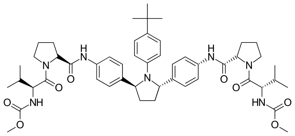 Keywords: Ombitasvir.svg Chemical structure of ombitasvir ABT-267 Own 20 30 4 October 2014 UTC Ed Edgar181 validSVG Carbamates Methyl esters Azolidines Tert-butyl compounds NS5A inhibitors