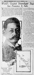 | Keywords: Omori San Francisco Call 05August1906.jpg en Image of Fusakichi Omori and his hand-drawn map of the San Andreas Fault accompanying an article he wrote for the San Francisco Call newspaper 05 August 1906 Dr Omori was a pioneering seismologist and the head of the Imperial Committee to investigate the 1906 San Francisco Earthquake He traveled the full length of the map shown describing and photographing effects of the earthquake on California landscapes homes and buildings San Francisco Call 05 August 1906 http //chroniclingamerica loc gov/lccn/sn85066387/1906-08-05/ed-1/seq-48/;words OMORI+Omori Fusakichi Omori 30 October 1868 - Fukui 8 November 1923 - Tokyo 1906-08-05 http //www flickr com/photos/gilsonrome/5531231466/ Creative Commons 2 0 license Taken from original microfilm version highlighting the diagram of the San Andreas Fault and the portrait of Dr Omori PD-old 1906 in San Francisco 1906 newspapers Black and white photographic portraits of men Fusakichi Ōmori Newspapers of California |