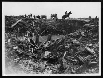 | Keywords: On the road to Gheluvelt.jpg en Destruction on the Menin Road Belgium 1917 The picture is one of chaos and devastation On top of the rise which is visible on the horizon men horses and carriages are silhouetted Some of the men seem to be moving rubble on to the carriages The focus of the front of the picture is a pool of water which has formed at the bottom of a very muddy ditch - possibly a crater caused by artillery fire The ground around the crater is littered with smashed pieces of wood and metal 1917 https //flic kr/p/89ggaH National Library of Scotland cc-zero Uploaded with UploadWizard 1917 in Belgium Horses in World War I Craters |