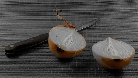 Keywords: onion food cooking knife vegetable brown black and white uncoloured black white half halves cuisine fresh ingredient raw uncooked freshness cut cry tears preparation skin peel chop