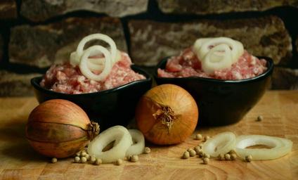 Keywords: onions onion rings minced meat schweinemett mett meat preparation cook eat tasty kitchen food hearty rustic