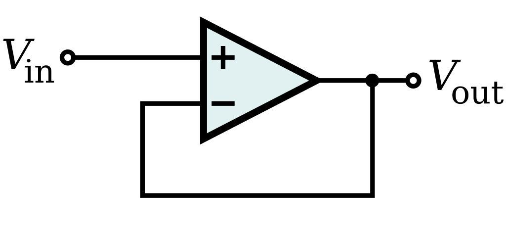 | Keywords: Op-Amp Unity-Gain Buffer.svg A circuit diagram of a buffer amplifier made using an operational amplifier <math> V_\mathrm out V_\mathrm in \ \ </math> <math>Z_\mathrm in \infin</math> realistically the differential input impedance of the op-amp itself 1 MΩ to 1 TΩ own 2009-01-26 Inductiveload Own work all rights released Public domain Operational amplifier circuits |