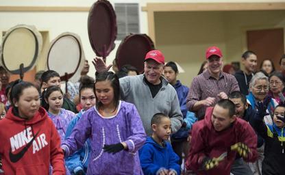 | Keywords: military ST. MARY'S, Alaska -- Alaska Gov. Bill Walker (center) and U.S. Senator Dan Sullivan (right) perform a traditional Yup'ik dance with students at the Elicarvicuar Elementary School here Dec. 5, 2015. The two joined a group of about 50 military members and volunteers who traveled here as part of Operation Santa Claus, an Alaska National Guard program to collect toys, school supplies and food staples and deliver them to school children in Alaska's remote communities. This mission was the second and final Op Santa mission of 2015. St. Mary's was the site of the original Operation Santa Claus in 1957. (U.S. Air National Guard photo by Capt. John Callahan/ Released) ST. MARY'S, Alaska -- Alaska Gov. Bill Walker (center) and U.S. Senator Dan Sullivan (right) perform a traditional Yup'ik dance with students at the Elicarvicuar Elementary School here Dec. 5, 2015. The two joined a group of about 50 military members and volunteers who traveled here as part of Operation Santa Claus, an Alaska National Guard program to collect toys, school supplies and food staples and deliver them to school children in Alaska's remote communities. This mission was the second and final Op Santa mission of 2015. St. Mary's was the site of the original Operation Santa Claus in 1957. (U.S. Air National Guard photo by Capt. John Callahan/ Released) |