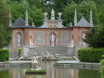 Keywords: open air theatre theatrum theater pond water feature roman theatre lords table hellbrunn salzburg austria landscaped garden stone figures markus sittikus renaissance it mannerism water dispenser