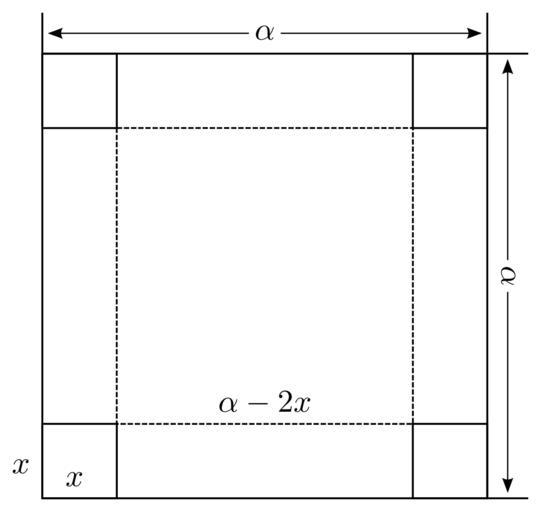 | Keywords: Open-top box.svg Elements of the Differential and Integral Calculus quote It is desired to make an open-top box of greatest possible volume from a square piece of tin whose side is a by cutting equal squares out of the corners and then folding up the tin to form the sides What should be the length of a side of the squares cut out 2012-04-28 own Eviatar Bach Created with Inkscape cc-zero Uploaded with UploadWizard Optimization Granville Elements of Calculus Files by User InverseHypercube |