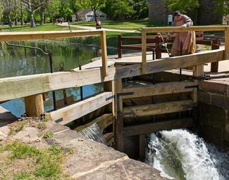 Keywords: Opening Paddle Valves on Lock Gate on C and O Canal.jpg en Opening paddle valves on gate of Lock 20 Chesapeake and Ohio Canal own Bonnachoven Chesapeake Ohio Canal National Historical Park Locks water transport Cc-zero
