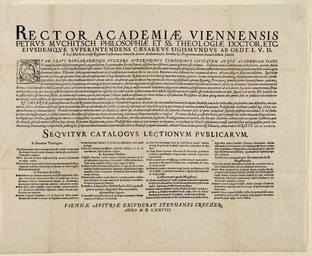 | Keywords: Opening Proclamation from University Authorities Prior to an Academic Term WDL4315.png Artwork ru учич Пите Годы асцвета тво чества 1572-1590 гг fr Muchitsch Peter actif de 1572 à 1590 en Muchitsch Peter Flourished 1572-1590 zh 马科茨 彼得 创 高峰 1572-1590 年 pt Muchitsch Peter Prosperou em 1572-1590 ar موشيتش بيتر تألق في الفترة 1572-1590 es Muchitsch Peter Prosperó entre 1572-1590 ru Вступительное об ащение униве ситетской админист ации пе ед началом семест а fr Proclamation d'ouverture par des autorités universitaires avant un trimestre scolaire en Opening Proclamation from University Authorities Prior to an Academic Term zh 学 前大学校长 的 学致辞 pt Proclamação de abertura das autoridades da universidade antes de um período letivo ar إعلان من سلطات الجامعة عن فتحها وبداية فصل دراسي ru Венский униве ситет основанный ге цогом Авст ии Рудольфом IV в 1365 г является ста ейшим униве ситетом в немецкоязычном ми е Как и в д угих ев опейских униве ситетах основным языком получения об азования был латинский Авто ом этого об ащения на латинском языке является Пет ус учич классический филолог и теолог дважды служивший екто ом униве ситета в 1577 1578 гг и снова в 1578 году В своем об ащении Пет ус п иглашает студентов п одолжить обучение по окончании эпидемии чумы 1578 г в Вене апечатанный в фо ме плаката документ соде жит одно из ста ейших сох анившихся асписаний лекций униве ситета с пе ечислением ку сов лекций на теологическом медицинском и ю идическом факультетах на факультете свободных искусств философии и языков с указанием ку сов отдельно для студентов обучающихся по п ог амме бакалав ов и магист ов а также совместных лекций <br>Плакаты; Ку сы обучения и лекции; Чума; П окламации; Венский униве ситет; Униве ситеты и колледжи fr L'Université de Vienne fut fondée par le duc Rodolphe IV d'Autriche en 1365 Il s'agit de la plus ancienne université du monde germanophone Comme c'était le cas dans d'autres universités européennes la langue d'enseignement principale était le latin Cette proclamation en latin fut écrite par Petrus Muchitsch philologue et théologien ayant exercé deux fois le poste de président de l'université entre 1577 et 1578 puis à nouveau en 1578 Dans ce message d'accueil Petrus invite les étudiants à reprendre leurs études après la fin de l'épidémie de peste de 1578 de Vienne Imprimé sous forme de placard le document comprend l'un des plus anciens calendriers de cours magistraux d'université encore existant énumérant les cours de la faculté de théologie de la faculté de médecine de la faculté de droit de la faculté d'arts libéraux de philosophie et de langues Il indique également quels cours étaient destinés aux étudiants de licence et aux étudiants de maîtrise de manière séparée et quels cours magistraux étaient communs <br>Placards; Enseignement et cours magistraux; Peste; Proclamations; Université de Vienne; Universités et collèges en The University of Vienna was founded by Duke Rudolph IV of Austria in 1365 and is the oldest university in the German-speaking world As at other European universities the primary language of scholarship was Latin This proclamation in Latin is by Petrus Muchitsch a classical philologist and theologian who twice served as rector of the university in 1577 78 and again in 1578 In this greeting Petrus invites the students of the university to resume their studies following the end of the 1578 epidemic of plague in Vienna Printed in the form of a broadside the document includes one of the oldest surviving lecture schedules of the university listing courses in the Faculty of Theology the Faculty of Medicine the Faculty of Law and the Faculty of Liberal Arts Philosophy and Languages and indicating which courses were for baccalaureate students and masters students separately and which were joint lectures <br>Broadsides; Courses and lectures; Plague; Proclamations; Universität Wien; Universities and colleges zh 维也纳大学由奥 利公爵鲁道夫四世(Rudolph IV)于 1365 年创建,是德语系国家里 古 的大学 同欧洲其他大学 样,它的基 学 语 是拉丁语 这份致辞由古典语 学家和神学家柏图斯·马科茨 Petrus Muchitsch 以拉丁语发表,他曾于 1577-1578 年间和 1578 年两次担任该大学的校长 致欢迎辞中,他 请学生们 1578 年的维也纳鼠疫结 后重新 始努力学习 此文件为单 印刷,包括大学幸存下 的 份 古 的讲座时间表 神学院课程列表 医学院课程列表 法学院课程列表 人文学院课程列表 哲学课程列表以及语 课程列表,并指明了专为 科生设立的课程 专为研究生设立的课程,以及为 科生和研究生共同设立的课程 <br>大幅印刷品; 课程和讲座; 瘟疫; 致辞; 维也纳大学; 大学和学院 pt A Universidade de Viena foi fundada pelo Duque Rudolph IV da Áustria em 1365 e é a mais antiga universidade do mundo de língua alemã Assim como em outras universidades europeias o idioma principal de ensino era o latim Esta procla