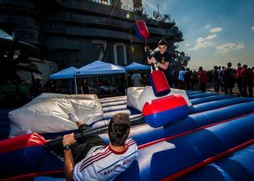 Keywords: Operation Inherent Resolve 141102-N-WD464-057.jpg en Sailors fight with pugil sticks on the flight deck of the Nimitz-class aircraft carrier USS Carl Vinson during a steel beach picnic Carl Vinson is deployed in the U S 5th Fleet area of operations supporting Operation Inherent Resolve strike operations in Iraq and Syria as directed maritime security operations and theater security cooperation efforts in the region 2014-11-02 CVN 70 https //www dvidshub net/image/1641876 141102-N-WD464-057 2014-11-03 19 36 USS CARL VINSON CVN 70 AT SEA PD-USGov-Military-Navy USS Carl Vinson CVN-70 Pugil sticks Images from DoD uploaded by Fæ