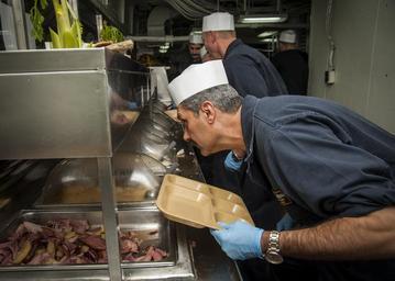 | Keywords: Operation Inherent Resolve 141127-N-WD464-180.jpg en Master Chief Electronics Technician Timothy Tony serves food on the mess decks during Thanksgiving dinner aboard the Nimitz-class aircraft carrier USS Carl Vinson Carl Vinson is deployed in the U S 5th Fleet area of responsibility supporting Operation Inherent Resolve strike operations in Iraq and Syria as directed maritime security operations and theater security cooperation efforts in the region 2014-11-27 CVN 70 https //www dvidshub net/image/1679145 141127-N-WD464-180 2014-11-27 10 48 USS CARL VINSON AT SEA PD-USGov-Military-Navy USS Carl Vinson CVN-70 Images from DoD uploaded by Fæ |