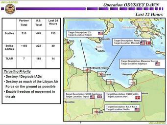| Keywords: Operation Odyssey Dawn - Last 12 Hours - 24 March 2011.jpg BadJPEG Operation Odyssey Dawn in Libya 2011 Libya Situation as of 24 March 2011 US Vice Admiral Bill Gortney Director of The Joint Staff On the slide to my left you will -- you will see a quick snapshot of what we have been doing the last day or so And I ™d like to just point out that the data I ™m going to provide is as of noon Eastern Standard Time today As you can see the coalition naval and Air Forces have been busy striking fixed targets and some of Colonel Gadhafi ™s maneuver forces along the coastline and near the cities of Tripoli Misrata and Ajdabiya Ships and subs at sea have launched another 14 Tomahawk cruise missiles at targets ashore and hitting an integrated air defense site near Sebha in the south and a Scud missile garrison near Tripoli We flew a total of 130 coalition sorties 49 of which were strike-related meaning they were designed to hit a designated target Of those total sorties roughly half were flown by pilots from partner nations In fact nearly all some 75 percent of the combat air patrol missions in support of the no-fly zone are now being executed by our coalition partners On Sunday that figure was less than 10 percent http //www defense gov/transcripts/transcript aspx transcriptid 4798 http //www defense gov/news/d20110324pptslides pdf 2011-03-24 U S Department of Defense Office of the Assistant Secretary of Defense Public Affairs PD-USGov Operation Odyssey Dawn Maps of the 2011 Libyan civil war |