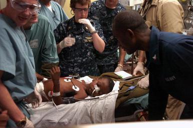 | Keywords: Operation Unified Response DVIDS241566.jpg en Medical professionals aboard the Military Sealift Command hospital ship USNS Comfort treat a six-year-old Haitian boy in the casualty receiving room aboard the 1 000-bed hospital ship The boy transferred to Comfort by helicopter from the aircraft carrier USS Carl Vinson for treatment for an injury to his bladder and a hip fracture during an earthquake that struck Haiti Jan 12 The boy is in the intensive care unit aboard Comfort in stable condition Comfort is supporting Operation Unified Response a joint operation providing humanitarian assistance to Haiti 2010-01-19 Photo by Petty Officer 3rd Class Timothy Wilson https //www dvidshub net/image/241566 100119-N-+++++-067 2010-01-20 04 09 USNORTHCOM AT SEA PD-USGov-Military-Navy USS Carl Vinson CVN-70 Operation Unified Response Images from DoD uploaded by Fæ |