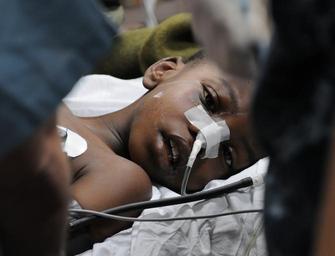 | Keywords: Operation Unified Response DVIDS241591.jpg en Medical professionals aboard the Military Sealift Command hospital ship USNS Comfort treat a six-year-old Haitian boy in the casualty receiving room aboard the 1 000-bed hospital ship The boy transferred to Comfort by helicopter from the aircraft carrier USS Carl Vinson for treatment for an injury to his bladder and a hip fracture during an earthquake that struck Haiti Jan 12 The boy is in the intensive care unit aboard Comfort in stable condition Comfort is supporting Operation Unified Response a joint operation providing humanitarian assistance to Haiti 2010-01-19 Petty Officer 3rd Class Chelsea Kennedy https //www dvidshub net/image/241591 100119-N-+++++-125 2010-01-20 04 20 USNORTHCOM AT SEA PD-USGov-Military-Navy USS Carl Vinson CVN-70 Operation Unified Response Images from DoD uploaded by Fæ |
