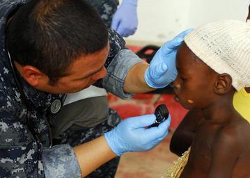 | Keywords: Operation Unified Response DVIDS243501.jpg en Petty Officer 3rd Class Sergio Hernandez hospital corpsman examines a young Haitian patient at the Hope Estate Medical Clinic in Neply Haiti The clinic is attended by members of the medical team from the amphibious transport dock ship USS Carter Hall providing medication triage and medical evacuations to residents in the area after an earthquake damaged nearby hospitals Carter Hall is supporting Operation Unified Response a joint operation providing humanitarian assistance following a 7 0 magnitude earthquake that devastated the island nation Jan 12 2010-01-22 Petty Officer 1st Class Monique Hilley https //www dvidshub net/image/243501 100122-N-+++++-099 2010-01-24 04 41 NEPLY HT PD-USGov-Military-Navy USS Carter Hall LSD-50 Operation Unified Response Images from DoD uploaded by Fæ |