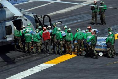 | Keywords: Operations aboard USS Ronald Reagan DVIDS98118.jpg en 080625-N-4005H-054 PACIFIC OCEAN June 25 2008 Sailors load cases of water bound for the Philippines onto an HH-60H helicopter assigned to the Black Knights of Helicopter Anti-Submarine Squadron HS 4 on the flight deck of the Nimitz-class aircraft carrier USS Ronald Reagan CVN 76 Ronald Reagan sent 12 000 bottles of water and 7 500 pounds of Rice to the Philippines supporting disaster relief efforts The Ronald Reagan Carrier Strike Group is support the government of the Republic of the Philippines to help provide humanitarian assistance and disaster relief to the victims of Typhoon Fengshen U S Navy photo by Mass Communication Specialist 3rd Class Aaron Holt Released 2008-06-25 Aaron Holt https //www dvidshub net/image/98118 080625-N-+++++-054 2008-06-28 14 09 USPACOM AT SEA PD-USGov-Military-Navy USS Ronald Reagan CVN-76 Images from DoD uploaded by Fæ |