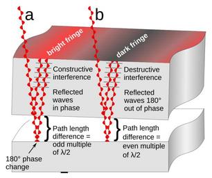 | Keywords: Optical flat interference.svg interference fringes are created by an optical flat The upper object is a section of a glass optical flat resting on another flat reflective surface Light rays red from a monochromatic light source pass through the flat and reflect from both the bottom surface of the glass and the surface it is resting on Since there is a tiny gap between the two surfaces the ray reflecting off the bottom surface travels a greater distance than the top ray It also experiences a 180° phase change at the reflection from the bottom plate the reflection from the top plate causes no phase change The parallel rays superpose At locations a where the extra distance travelled by the 2nd ray twice the width of the gap is equal to an odd multiple of a half-wavelength λ/2 of the light the two reflected waves will be in phase and will add reinforcing each other resulting in a bright reflected ray This is called constructive interference At other locations b the path difference between the rays is equal to an even multiple of λ/2 so the reflected waves are 180° out of phase They subtract canceling each other out resulting in little or no reflected light This is called destructive interference When the two surfaces are not parallel as in the diagram this results in a pattern of alternating bright and dark bands visible on the surface called interference fringes Two adjacent interference fringes represent a difference in height of the surface of one-half wavelength of the light used so interference patterns can be used to measure the flatness of surfaces to millionths of an inch In this diagram the width of the gap and the wavelength of the light waves is greatly exaggerated; light has wavelengths around 10<sup>-7</sup> meter 2012-03-03 own Chetvorno cc-zero Interference English text |