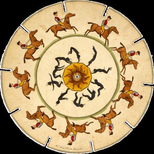 | Keywords: Optical illusion disc with somersaults and horseback riding.gif Optical illusion disc which is spun displaying the illusion of motion of a figure doing somersaults in a circle at the center of the disc and a man horseback riding in a circle at the outer edge of the disc Part of McLean ™s Optical Illusions or Magic Panorama a boxed set of 12 discs Hand-colored lithograph LOC-image cph 3g08088 pnp 1833 author Published by Thomas McLean PD-retouched-user Racconish 1833 in England Phenakistoscope PD-old-100 |