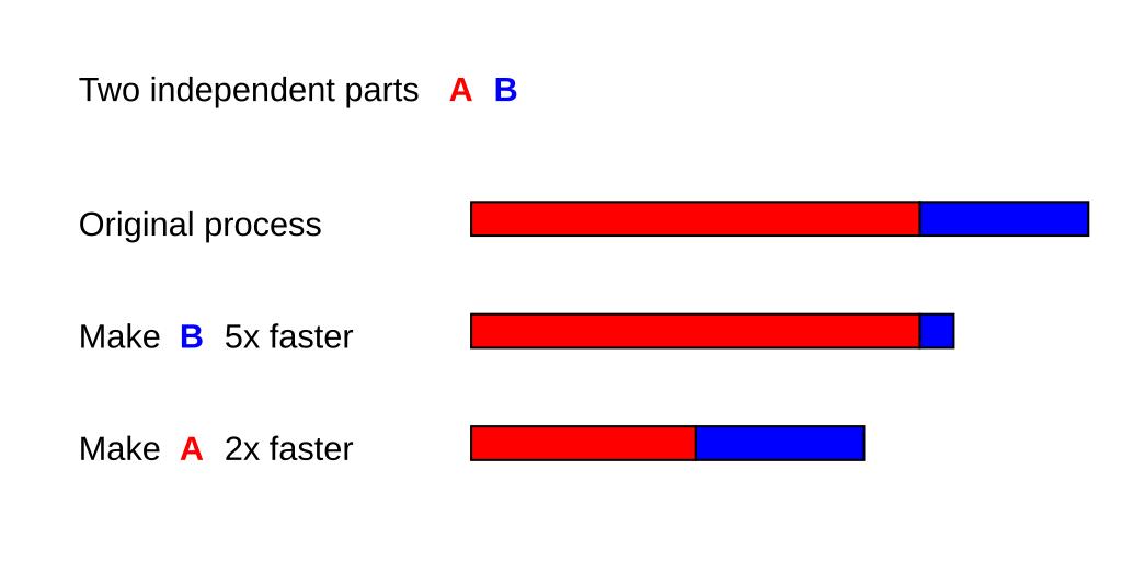 | Keywords: Optimizing-different-parts.svg Assume that a task has two independent parts A and B B takes roughly 25 of the time of the whole computation By working very hard one may be able to make this part 5 times faster but this only reduces the time for the whole computation by a little In contrast one may need to perform less work to make part A be twice as fast This will make the computation much faster than by optimizing part B even though B got a bigger speed-up 5x versus 2x <br /> explanation taken from caption in wikipedia Amdahl's law own 2008-01-10 Gorivero Optimizing-different-parts png Optimizing-different-part-ar svg Optimizing-different-parts-ca svg Optimizing-different-part-es svg File Optymalizacja-roznych-czesci svg Optimizing-different-parts-tr svg other fields Inkscape 59648 1273 u MetrĂ³nomo text + S Translate Amdahl's law English text |