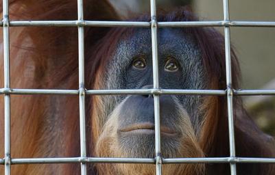 Keywords: orang utan ape primate old world monkey tree climbers melancholic mourning psychic pain freedom mimic imprisoned cage rainforest long hair thinking close