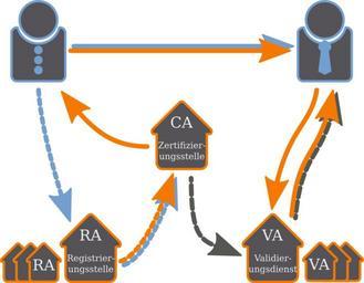 | Keywords: Orange blue public key infrastructure 1 de.text.svg en Principle of a public key infrastructure A user applies for a certificate with his public key at a registration authority RA The latter confirms the user's identity to the certification authority CA which in turn issues the certificate The user can then digitally sign a contract using his new certificate His identity is then checked by the contracting party with a validation authority VA which again receives information about issued certificates by the certification authority de Prinzip einer Public-Key-Infrastructure Teilnehmer authentifiziert sich gegenüber Registrierungstelle diese bestätigt den öffentlichen Schlüssel des Teilnehmers gegenüber der Zertifizierungsstelle Die Zertifizierungsstelle stellt dem Teilnehmer ein Zertifikat aus Der Teilnehmer kann sich gegenüber einer anderen Person/Entität mit dem Zertifikat authentifizieren Die andere Person/Entität kann das Zertifikat von einem Validierungsdienst überprüfen lassen 2012-06-15 own Bananenfalter <gallery> File Public-Key-Infrastructure svg Original version File Orange blue public key infrastructure 1 de svg Preferred version </gallery> Similar Images <gallery> File Orange blue public key infrastructure 2 de text svg PKI with text File Orange blue public key infrastructure 3 de text svg PKI detail registration File Orange blue public key infrastructure 4 de text svg PKI detail verification </gallery> cc-zero translatable Uploaded with UploadWizard Orange blue cryptography diagrams |