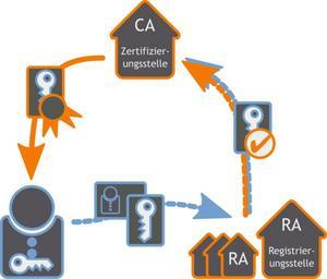 | Keywords: Orange blue public key infrastructure 3 de.svg en Principle of a public key infrastructure A user applies for a certificate with his public key at a registration authority RA The latter confirms the user's identity to the certification authority CA which in turn issues the certificate de Prinzip einer Public-Key-Infrastructure Teilnehmer authentifiziert sich gegenüber Registrierungsstelle diese bestätigt den öffentlichen Schlüssel des Teilnehmers gegenüber der Zertifizierungsstelle Die Zertifizierungsstelle stellt dem Teilnehmer ein Zertifikat aus 2012-06-15 own Bananenfalter <gallery> File Public-Key-Infrastructure svg Original version File Orange blue public key infrastructure 3 de text svg Translateable version </gallery> Similar Images <gallery> File Orange blue public key infrastructure 1 de svg PKI without text File Orange blue public key infrastructure 2 de svg PKI with text File Orange blue public key infrastructure 4 de svg PKI detail verification </gallery> cc-zero Uploaded with UploadWizard Orange blue cryptography diagrams |