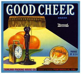 | Keywords: sunkist orange crate art orangecrateart text cartoon Repository: California Historical Society Collection: Crate, can, and bottle label collection Date: Undated Call Number: Kemble Spec Col 08 Digital object ID: Kemble Spec Col 08_044.jpg General note: Sunland Packing House Co., Growers and Packers, Porterville, California Preferred citation: Orange crate label, Good Cheer Brand, Western Litho. Co., Crate, can, and bottle label collection, Kemble Spec Col 08, courtesy, California Historical Society, Kemble Spec Col 08_044.jpg. Online finding aid: www.oac.cdlib.org/findaid/ark:/13030/c8s75jq0/ Repository: California Historical Society Collection: Crate, can, and bottle label collection Date: Undated Call Number: Kemble Spec Col 08 Digital object ID: Kemble Spec Col 08_044.jpg General note: Sunland Packing House Co., Growers and Packers, Porterville, California Preferred citation: Orange crate label, Good Cheer Brand, Western Litho. Co., Crate, can, and bottle label collection, Kemble Spec Col 08, courtesy, California Historical Society, Kemble Spec Col 08_044.jpg. Online finding aid: www.oac.cdlib.org/findaid/ark:/13030/c8s75jq0/ |