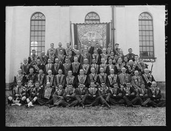 | Keywords: loyal orange lodge loyalorangelodge doyle orange lodge orangelodge orange order orangeorder proni allison allison & co. photographers allisoncophotographers group portrait groupportrait genealogy ancestry ulster armagh northern ireland northernireland blackandwhite monochrome photo border team sport sport black and white Creator: H. Allison & Co. Photographers Date: c.1930 Original Format: Glass Plate Negative Description: Group portrait of members of a Loyal Orange Lodge. Commissioned by Doyle. PRONI Ref: D2886/W/Portrait/153 Copying and copyright: Please see www.proni.gov.uk/index/research_and_records_held/copying_... For Copy Orders, contact: Email: proni@dcalni.gov.uk For fees and charges see: www.proni.gov.uk/index/about_proni/are_there_any_fees_and... Creator: H. Allison & Co. Photographers Date: c.1930 Original Format: Glass Plate Negative Description: Group portrait of members of a Loyal Orange Lodge. Commissioned by Doyle. PRONI Ref: D2886/W/Portrait/153 Copying and copyright: Please see www.proni.gov.uk/index/research_and_records_held/copying_... For Copy Orders, contact: Email: proni@dcalni.gov.uk For fees and charges see: www.proni.gov.uk/index/about_proni/are_there_any_fees_and... |