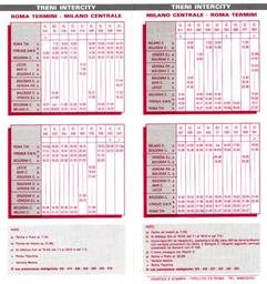| Keywords: Orario estivo 1987 - Treni Intercity Milano-Roma.gif it Treni Intercity Milano-Roma nell ™orario estivo 1987 delle Ferrovie dello Stato <br/> Con l'orario estivo 1987 il servizio sulla linea Milano-Roma fu rivoluzionato l'offerta di un treno Intercity ogni ora al posto di tre TEE un rapido e qualche espresso offrì un salto di qualità paragonabile all'apertura della Direttissima Bologna-Firenze del 1934 <br/> Anche il tempo di percorrenza di 5 ore e 10 minuti fu un risultato notevole a Direttissima Firenze-Roma ancora incompleta e con velocità massima di 200 km/h 1987 http //www stagniweb it/libri/o87rm gif Ferrovie dello Stato other versions Custom license marker 2016 08 20 PD-scan Train timetables in Italy 1987 in rail transport in Italy InterCity Italy Stagniweb |