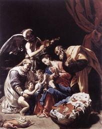 | Keywords: Orazio Borgianni - Holy Family with St Elizabeth, the Young St John the Baptist and an Angel - WGA02470.jpg Artwork Creator Orazio Borgianni Holy Family with Music-Playing Angel Saint Elisabeth and the Infant John the Baptist Handing the Dove an Allegory of the Holy Spirit to Jesus ca 1609 Oil on canvas size cm 257 202 Institution Galleria Nazionale d'Arte Antica Rome object history Rome church of San Giovannino in the complex of San Silvestro in Capite; 1871 monastery of the Poor Clares of San Silvestro in Capite; 1922 current location credit line accession number 5005 WGA link 2470 http //www wga hu/art/b/borgiann/holyfami jpg http //www wga hu/html/b/borgiann/holyfami html PD-old-100 painting religious Italian 1601-1650 WGA form painting WGA type religious WGA School Italian WGA time period 1601-1650 DEFAULTSORT Borgianni Orazio; Holy Family with St Elizabeth; Galleria Nazionale d'Arte Antica Orazio Borgianni Paintings in the Galleria nazionale d'arte antica Rome 17th-century paintings of Holy Family 18th-century paintings of Madonna and Child with the Infant Saint John 18th-century paintings of Saint Elisabeth 1600s paintings in Italy 1609 oil on canvas paintings 17th-century oil on canvas paintings in Italy 17th-century paintings of angels with humans Angels on the ground Angels with string instruments Paintings of angels in Rome Paintings of baskets Red curtains in art |