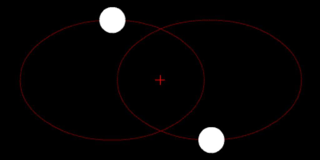 | Keywords: Orbit5.gif Two bodies with similar mass orbiting around a common barycenter red cross with elliptic orbits Dwa ciała o jednakowych masach krążące po orbitach eliptycznych wokół wspólnego barycentrum układ potencjalnie niestabilny Own User Zhatt Zhatt 100px 100px 100px 100px Animations of Kepler motions Two-body problem Barycenter animations Animations on black background Animated GIF |