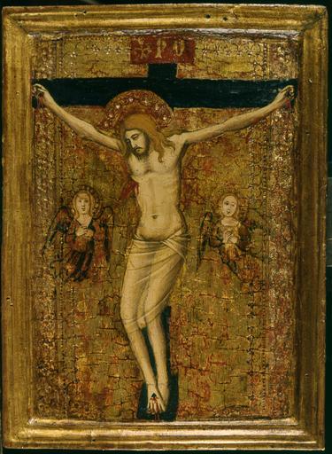| Keywords: Orcagna - The Crucifixion - Walters 372405.jpg Though seemingly self-contained this panel is actually a fragment of a larger painting that was cut in half across the middle The tops of two haloes are all that remain of Mary and St John the Evangelist who originally flanked the cross in the lower half of the panel now missing While the Armenian bole a red earth pigment foundation beneath the gold leaf shows through in many places the figure of Christ is in excellent condition Orcagna's attention to the anatomical details of Christ's torso reveals his training as a sculptor For more information on this piece please see Zeri catalogue number 6 p 12 between 1350 1359 Medieval tempera and gold leaf on panel cm 20 3 14 5 1 3 ; Painted surface cm 17 5 12 5 accession number 37 2405 34649 Federico Pedulli Florence 1905 mode of acquisition unknown Judge and Mrs Jacob M Moses Baltimore 1905 by purchase Walters Art Museum Gift of Judge and Mrs Jacob M Moses 1964 Transcription Inscribed at the top of the cross with a cross PO place of origin Florence Italy Walters Art Museum license 3D Medieval art in the Walters Art Museum Andrea Orcagna Paintings in the Walters Art Museum Media contributed by the Walters Art Museum needs category review |