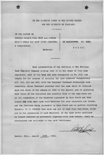 | Keywords: Order for receiver to surrender cash registers - NARA - 292703.tif Scope and content This order directs the court receiver to turn four cash registers over to the National Cash Register Company and remove them from property to be sold at the public auction of Buffalo Bill's Wild West Show General notes 292703 Local identifier U S District Court for the District of Colorado 1876 - NARA's Rocky Mountain Region Denver NRGA Building 48 Denver Federal Center West 6th Avenue and Kipling Street Denver CO 80225-0307 1913-08-18 Record group Record Group 21 Records of District Courts of the United States 1685 - 2004 Record group ARC 350 Bankruptcy Case Files compiled 1876 - 1948 Series ARC 292683 File unit Petition for Ancillary Receiver in Re Buffalo Bill's Wild West and Pawnee Bill's Great Far East Combined 07/31/1913 - 09/26/1913 File unit ARC 292684 Variant control numbers NAIL Control Number NRG-21-E19-2556-ORDER7 yes Other versions NARA-cooperation PD-USGov Buffalo Bill's Wild West Show NCR Corporation |