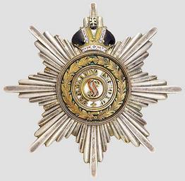 | Keywords: Order of St. Stanislas (Russia) Grand Cross Star with Crown 2.jpg a 1st Class Breast Star with crown Silver gold and enamel The reverse of the star gilt the crown attached with two rounded nuts The medallion plate with the rare jeweller's mark NP for Nichols Plinke and St Petersburg mark of fineness for 84 zolotniki Originally from http //www hermann-historica com/ 2008-04-08 Original uploader was kwasura Original upload licensing was PD-RU-exempt PD-RU-exempt Russian Order of Saint Stanislaus Stars of orders |