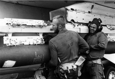 | Keywords: Ordnance men apply Mk 82 to VF-194 F-8E c1967.jpg Aviation Ordnanceman Second Class R P Wilson of Hinton West Virginia left and Aviation Ordnanceman Third Class D A Bibbee of Portland Oregon place a bomb on the rack of an F-8E Crusader aboard the attack aircraft carrier USS Ticonderoga CVA-14 During recent months the fighter aircraft have been doubling as attack aircraft Squadron 194 pilots have dropped over 135 000 pounds on enemy targets 295600 ca 1966-1968 USN PD-USGov F-8E Crusader Aboard USS Ticonderoga CV-14 Fighter Squadron 194 United States Navy Mark 82 bomb |